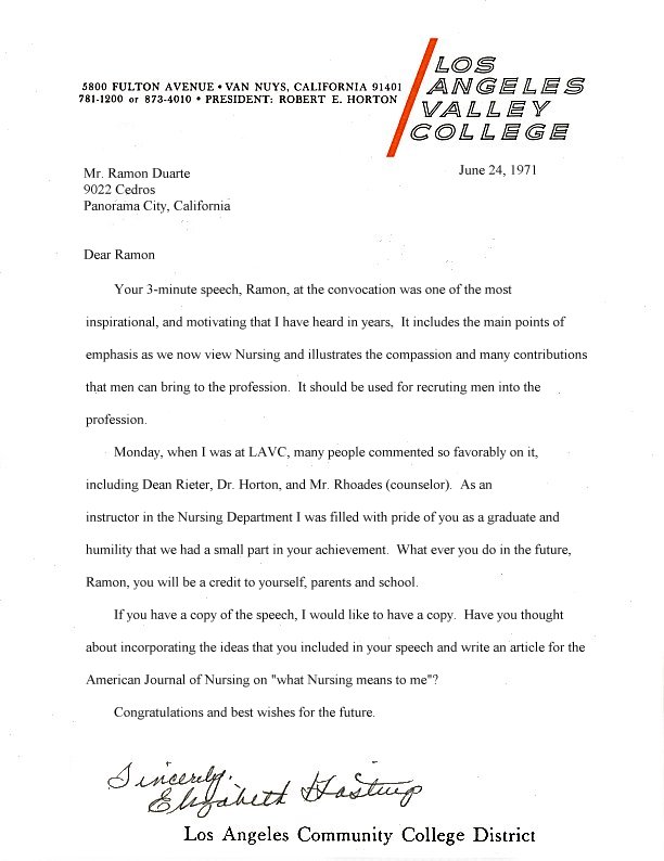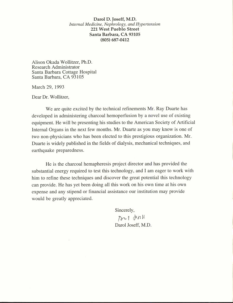 “DAYS OF FUTURE PAST” a recollection: Duarte has taken the liberty to assemble documentation of some of the projects he feels privileged to have been a part of over these many years. As we review the collection of documents he reveals that in the course of thirty-six years he has performed over 12,800 dialysis treatments for more than 5000 patients. His Major in High School was “Science-Math College Prep”. Unknown to his parents and counselors until graduation, he quietly completed every course in advance mathematics, physics, chemistry, and physiology that Sylmar High School could offer. He also completed all of the advanced senior courses in composition and met the foreign language requirement for a Major in that discipline if he had so chosen. He did so by taking advance courses in summer school. Duarte recalls his counselor saying that he had qualified for five different Majors but that only one could be recognized on his diploma. He chose Science. Because he maintained high marks in his classes he was awarded one of Sylmar High School’s first Scholar Athlete Awards for Lettering in Varsity Football and maintaining his grades at a higher level. Upon Graduation he was selected as a speaker to represent his Class. He worked as an Orderly for 2 years while he studied to become a Licensed Vocational Nurse (LVN), then worked as an LVN for 2 years as he completed his Registered Nurse (RN) training. The RN program at Los Angeles Valley College were 2 full academic years in Nursing and 2 full academic years in General Education which amounted to 4 years of College compressed into 2 years. Students are no longer allowed to take these Nursing courses concurrently with lower division GE courses. Upon Graduation he was selected to be a speaker of their Nursing Class. Because of his background in Science and Math and his interest of anatomy and physiology it was no wonder that upon completing his RN training he chose to apply for employment at the “melting pot” of the medical world, Los Angeles County USC Medical Center. In 1971 it was affectionately referred to as "BIG G". Renal Ward 4000 was where miracles happened. The training was 2 years in length requiring the graduate nurse to establish and display ICU/CCU skills. The first leg of the rotation began with the care of the patient undergoing kidney transplantation. These renal nurses in 1971 became proficient in every aspect of renal replacement therapy – kidney transplant, peritoneal dialysis, and under hemodialysis, they were trained in self-care, home care, in-patient care and acute care hemodialysis. This type of training does not exist any longer and Duarte feels fortunate to have experienced it. Duarte says, "I owe a debt of gratitude to Eugenia Orellanos, RN and Dr. Benjamin Barbour who were two of the primary designers of this marvelous program." With apologies to Charles Dickens “IT WAS the best of times, it was the worst of times” in 1971 for anyone who cared about there fellow human beings in service of renal replacement therapies. This particular service in the United States brought together rich and poor patients, people of all races, creeds and nationalities because treatment for kidney failure was limited and difficult to obtain. This was the time when names were drawn out of a hat to determine who might live and who would die. This was also the time when many that are now treated with dialysis and kidney transplantation as a routine matter would have not been chosen at all. At the time Duarte was hired he was cautioned that there was a 25% probability he could contract hepatitis with a 1% probability of mortality. Recently it has been determined that newly trained professionals have a 40% probability of morbidity in the first year with a 10% probability of mortality over all. The nurse recruiter advised Duarte at the time of newly developed principles and procedures for “Universal Hazards” in infection control to be implemented and strictly enforced. In short there were no guarantees of his safety as he proceeded with his training in this field. Having already toured the renal unit and so moved by the courage of these patients, all he wanted was the privilege to be of service. Few realize the risk he and his colleagues face each day they go to work. Life has it challenges. In 1971 the treatments for the most part were 6 hours long. Their staff of technicians assembled the dialyzers (artificial kidney filters); these artificial kidney filters were primed with formaldehyde and rinsed with sterile normal saline. Because they were using plate dialyzers no blood pumps were required for patients with Scribner Shunts (patients with Cemino Fistulas and Grafts did use blood pumps). The technology for air foam detection was non-existent, and therefore the nurses, technicians and patients were ever vigilant and fearful for air in the lines with blood flows at a rate of 300 to 500 cc a minute. The patients were taught to know, as much as possible, and in some cases as much as the nurses and technicians knew to participate in there own care. Ruptured membranes in the dialyzers (or kidney filters) were a common occurrence and the blood loss was so great that blood transfusions were always required. Training in this area was frightening. There were so many steps to learn in the care of the patient; nothing in the way of equipment was automated, and the nurse had to react competently and without hesitation in all emergencies even if still not fully trained– they were incredibly short of staff. "I felt fear as I began my training, cognizant of the many things that could go wrong", says Duarte. "My hands would not shake, my concentration intensely focused, I would then begin to perspire profusely." It was a non-verbal physiological response that, though most uncomfortable, communicated to his patients without any words that he cared and wanted nothing but the best for them. The only way he could promote his comfort and